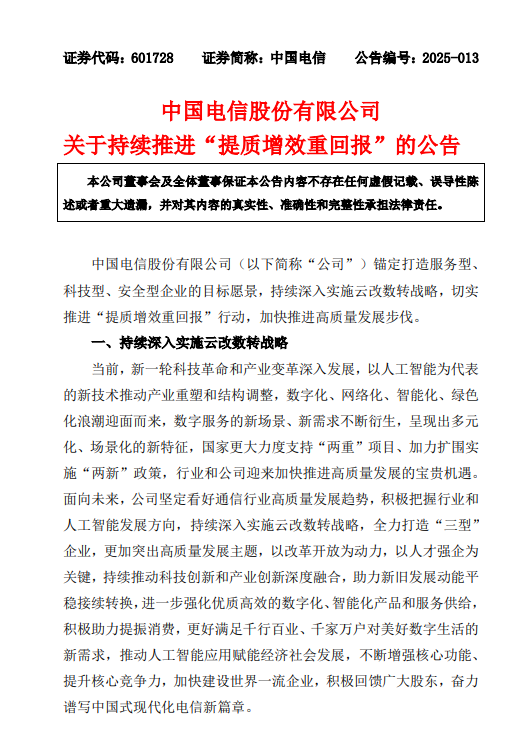 中国电信表示,公司始终高度关注股东回报,努力增强盈利和现金流创造能力,董事会已决定向年度股东大会建议公司2024年度以现金方式分配的利润为本年度本公司股东应占利润的72%,全年派发股息总额同比增长11.4%,自发行A股上市以来,累计分红金额达到786.17亿元人民币(含2024年度末期股息)。